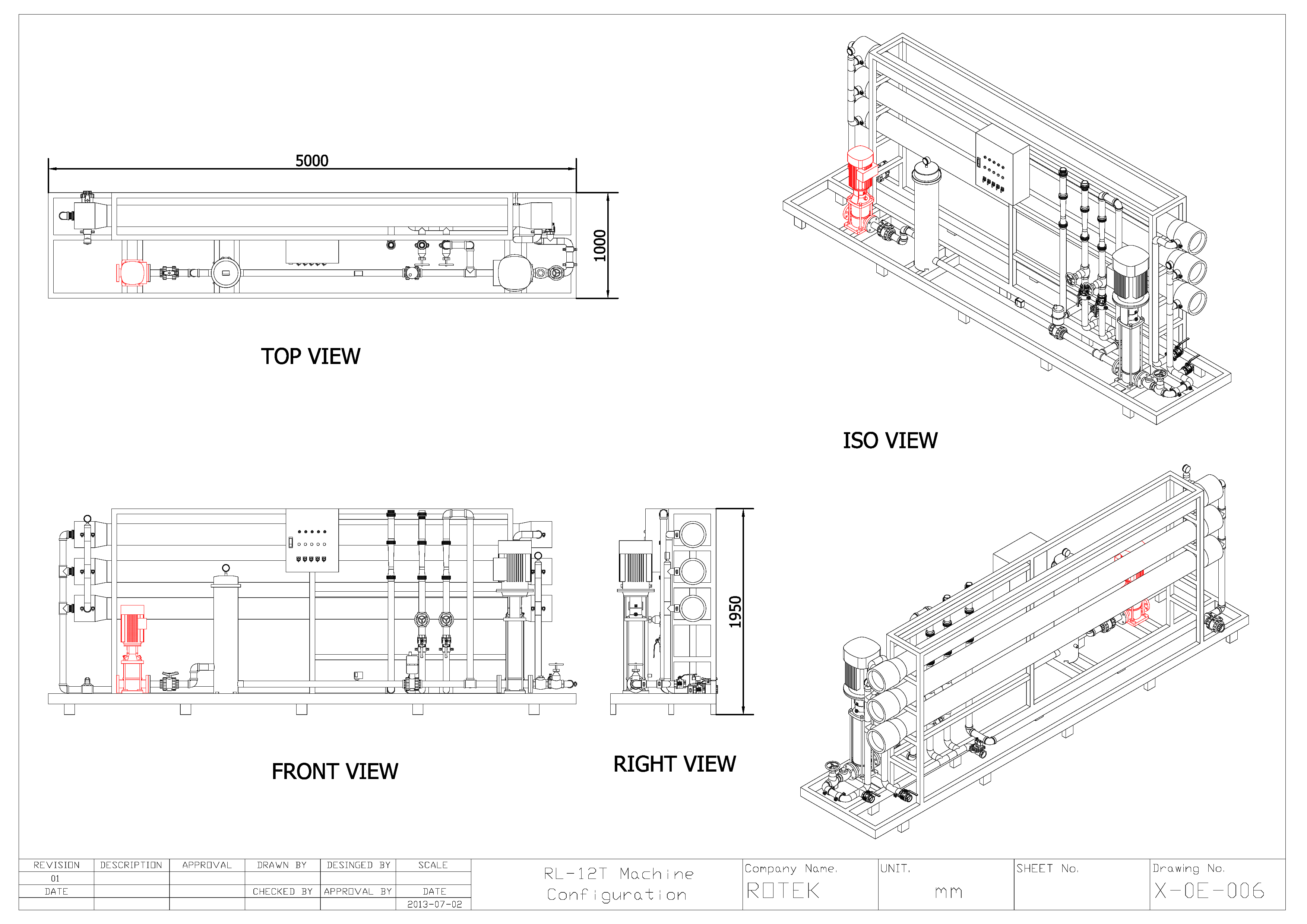 RL series RO systems are skid mounted with stainless steel frame, pre plumbed and pre wired allowing for quick installation and start up. Models are available with permeate outputs of between 3,000 and 50,000 litres/hr as shown in the specifications.