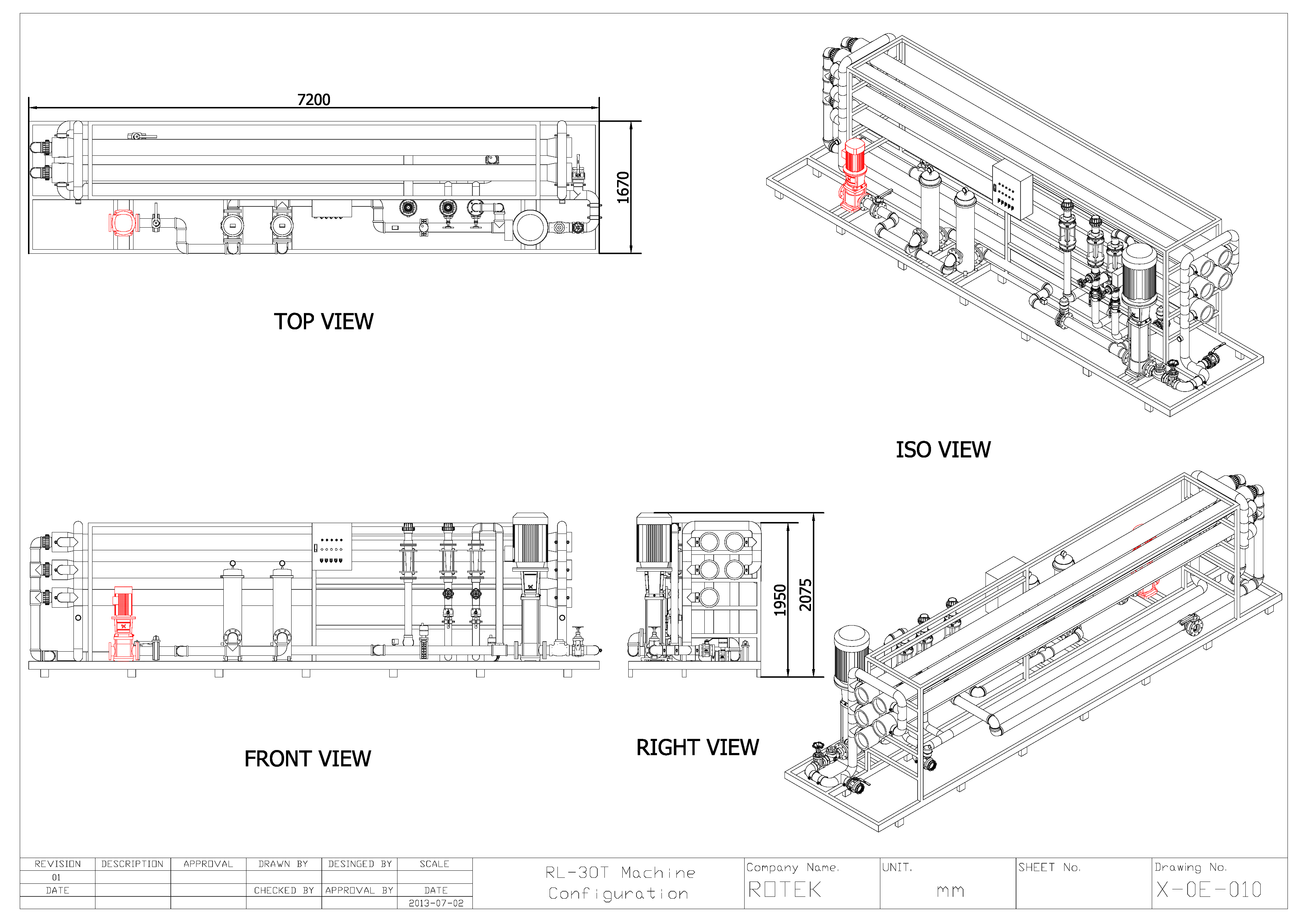 RL series RO systems are skid mounted with stainless steel frame, pre plumbed and pre wired allowing for quick installation and start up. Models are available with permeate outputs of between 3,000 and 50,000 litres/hr as shown in the specifications.